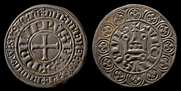 На фото 1) римський динарій імп. Августа із шестикутною зіркою – сонцем та півмісяцем, як на гербі Тернополя і Тарнова, заснованого у 1307 році!!! 2) срібна монета тамплієрів “gross denarius”. Пізніше залишилося тільки слово “gross” – великий, а вже потім воно перетворилось на слово grosch – грош. Над короною зображено мальтійський хрест – символ тамплієрів та королівські лілеї