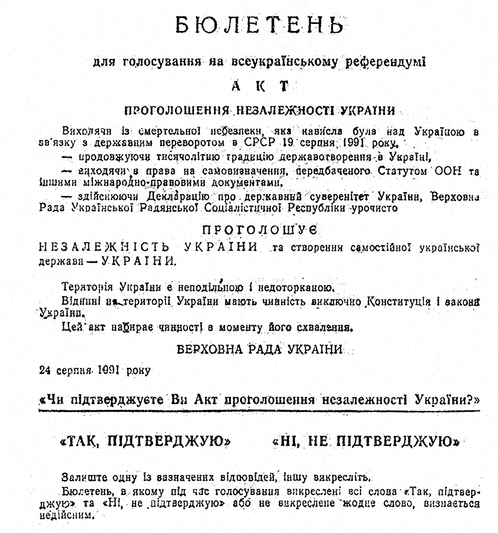 1 грудня 1991 року понад 90 % громадян України своїм вільним волевиявленням підтвердили Акт проголошення незалежності України, поставивши останню крапку в 70-річній історії існування радянської імперії та розпочавши новий відлік державотворення в українській історії.
