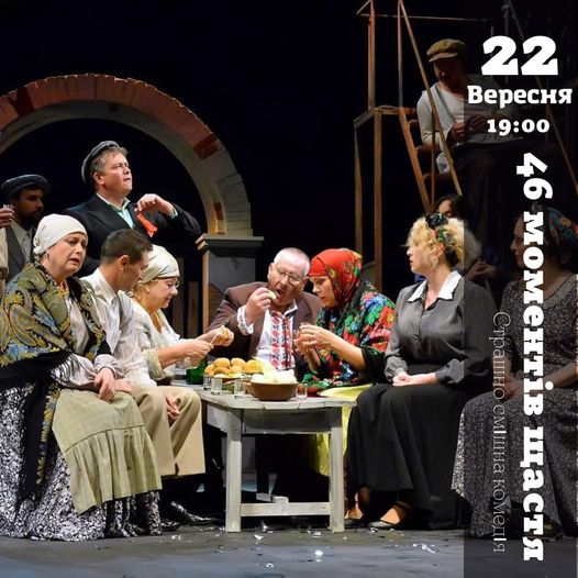 Сьогодні об 19:00 год. в Тернопільському обласному драматичному театрі відбудеться показ комедії «46 моментів щастя».Комендія передбачає «Історія Левка — щемливі спогади про раннє дитинство… Мріями він лине у свій маленький, затишний дворик, де проходило бурхливе життя багатодітних сімей, згадує веселі ігри численної дітлашні, місцевого філософа-Дивака, мамине й татове захоплення кінематографом… А ще — двох найрідніших, суворих і навдивовижу добрих бабусь, Дашу та Розу, які у своєму перебільшеному піклуванні «живою втіхою» змагалися за його виховання, пізнання світу, віри, любові… Які ж приємні ці спогади… Ці надзвичайні моменти щастя…» — зазначають у театрі.