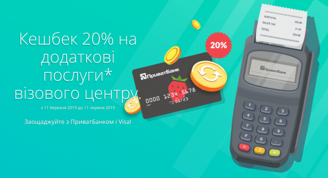 Акція ПриватБанку і Visa з кешбеком 20% на додаткові послуги візового центру VFS Global з 11 березня по 11 червня 2019 року.