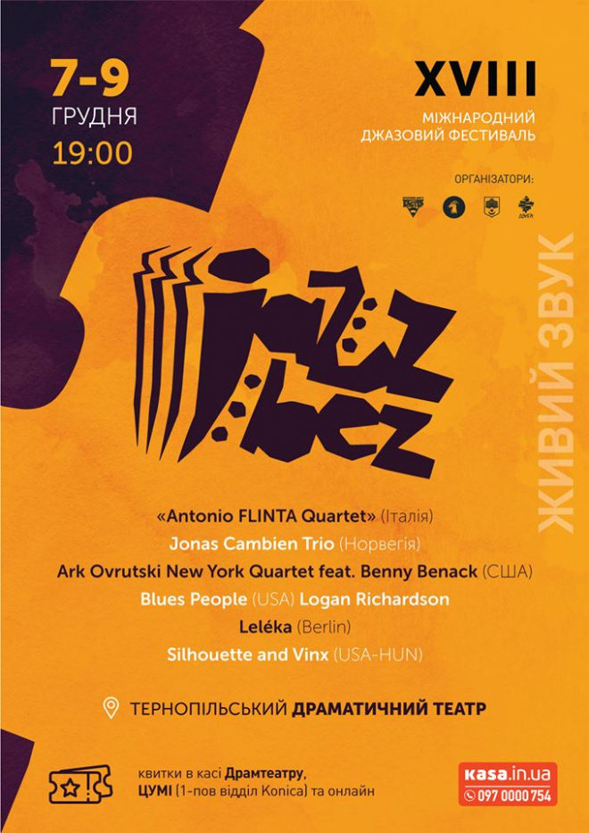 XVIII Міжнародний джазовий фестиваль JazzBez оселиться в Тернополі 7-9 грудня. На ці дні місто перетвориться в епіцентр музичних контрастів, варіацій та імпровізацій. До Тернополя приїдуть легенди джазу, флагмани актуального саунду, прихильники урбаністичного та фолькового звучання. Лунатимуть й українські мелодії в джазовій обробці.