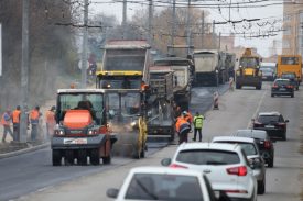 Будівельна техніка здійснює фрезерування та влаштування верхнього шару асфальтобетонного покриття. У зв’язку з цим рух транспорту на вулиці частково перекритий.