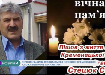 Помер голова спілки ветеранів Афганістану. Мова йде про голову Кременецької cпiлки Cтецюка Cтепана Володимировича. https://m.youtube.com/watch?v=-4T2zqVj45g