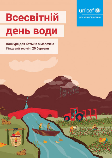 Напередодні Дня води (22 березня) Дитячий фонд ООН UNICEF Ukraine пропонує батькам поговорити з дітьми про роль та значення води, про необхідність дбайливого до неї ставлення, та зробити разом творчу роботу на цю тему. Обирати можна будь-яку творчу техніку.