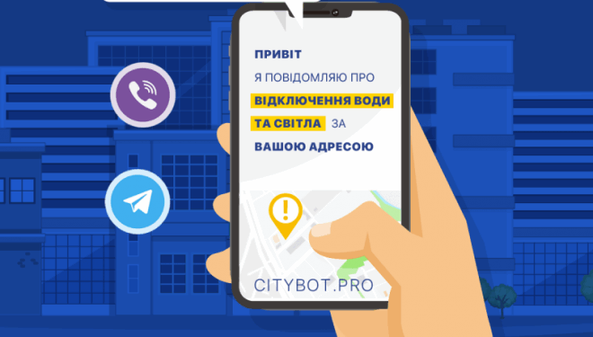 Сіті-бот сповіщає жителів міста щодо планових та аварійних відключень міських комунікацій (вода, світло, газ, опалення тощо) за вказаною адресою.