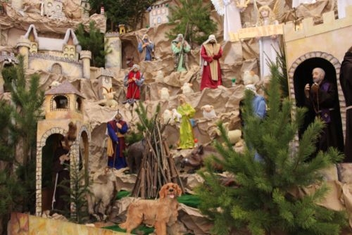 У конструкції можна побачити Ісуса з Марією та Йосипом, царів, які ідуть з дарами, монахів, селян, святих, ангелів, дітей, а також свійських та диких тварин, безліч засніжених будиночків, у вікнах яких горять вогні, штучний струмочок тощо. В цьому році шопку дещо оновили, доповнили її новими деталями та освітленням.