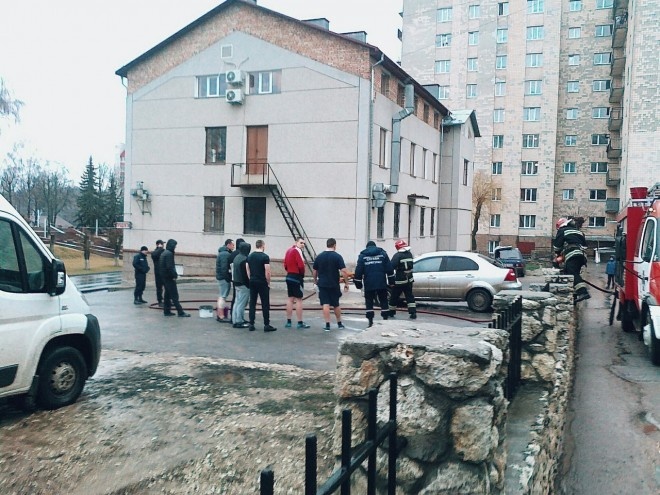 Спочатку охоронці ТНЕУ, на території якого знаходиться спортивний клуб, спробували самотужки погасити пожежу за допомогою порошкового вогнегасника.