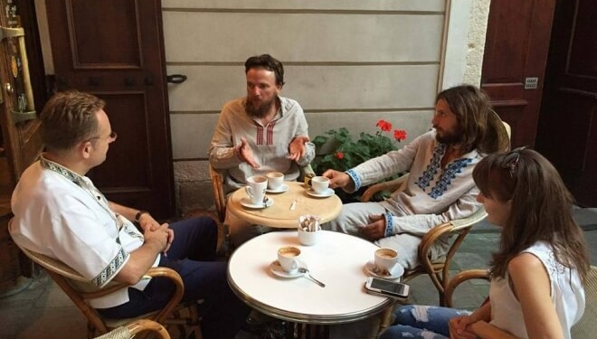 Приходимо до Львова, даємо одне інтерв’ю на радіо і вже після ефіру, на виході нас чекають Євген та Христина, керівники прес-служби та внутрішнього апарату міськради Львова. Вони запрошують нас на піцу, на Площу Ринок і ми так цікавенько спілкуємось. І тут Євген каже, а зараз буде мер. Тільки но ми вийшли із піцерії і дійшли до Світу Кави, як тут раз і на тобі – Андрій Садовий. Він нас впізнав відразу і ми його теж!)