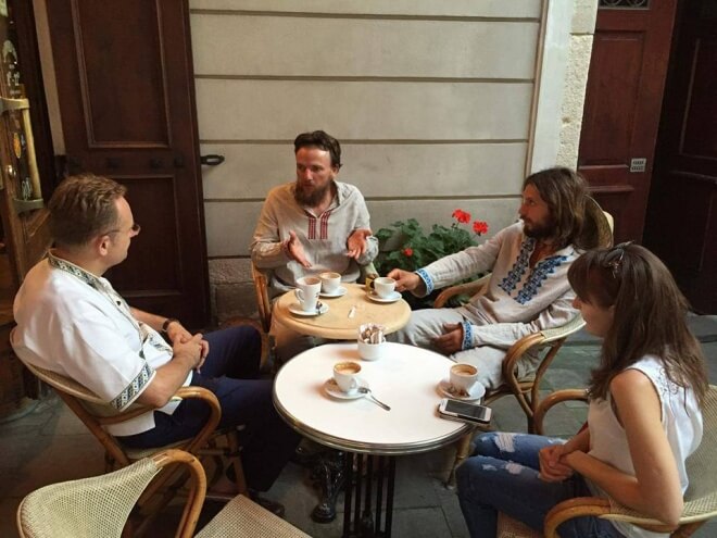 Зазвичай ми не п’ємо каву та вирішили все ж покуштувати цього напою на цей раз. Андрій говорить із нами про наші ноги, Львів, подорожі, жінок і т.д. Також до нас підходить Парасюк на хвилинку, але я його не впізнаю. Та й він нас, так що 1-1)