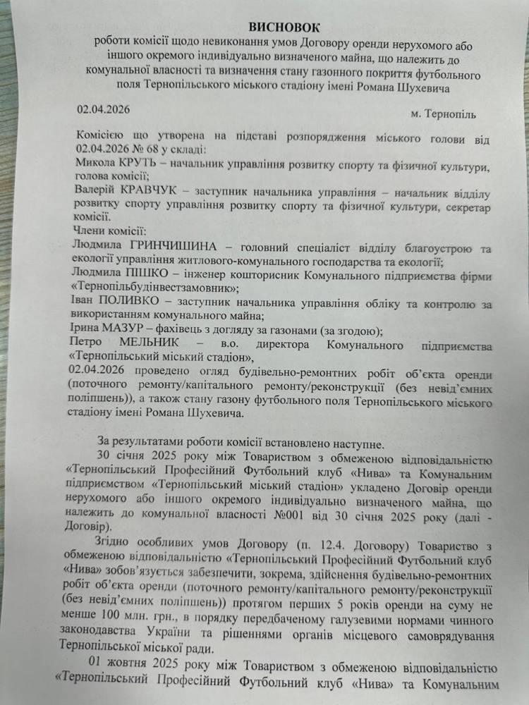 Останні заяви ФК «Нива» про «безпідставні перешкоди» з боку мерії Тернополя викликали резонанс серед вболівальників. Однак результати роботи контрольної комісії (Розпорядження №68) проливають світло на реальний стан справ: стадіон став заручником невиконаних обіцянок інвестора.