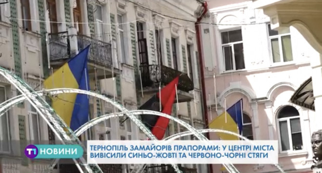 У центрі Тернополя вивісили великі синьо-жовті та червоно-чорні прапори.