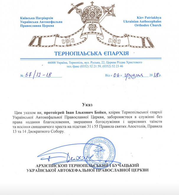«Прикрим і неприпустимим є те, що протоієрей Іван Бойко не тільки не покаявся, але й продовжує звершувати богослужіння і таїнства, всупереч особисто отриманому і власноруч підписаному Указу», – повідомляє прес-служба Тернопільсько-Бучацької єпархії ПЦУ.