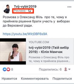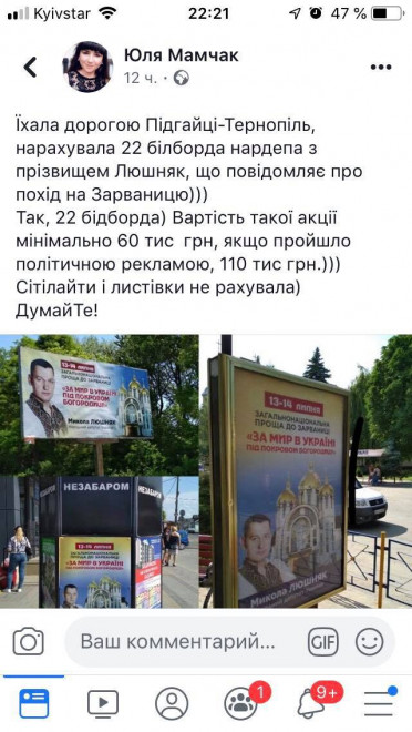 файним фото. І бюджет її рекламної кампанії у два або три рази перевищує витрати на рекламу прощі до Зарваниці. Отже, Прощу рекламувати зась, а себе рідну – прошу. Крім зовнішньої політичної кампанії на бордах Юлія Мамчак розмістила рекламу свого інтерв’ю в соціальній мережі Фейсбук на десятки тисяч гривень.