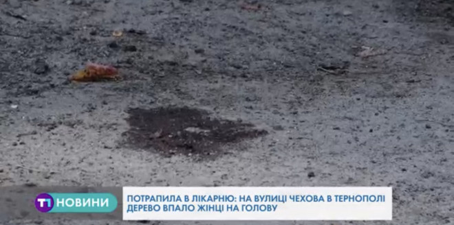 Сліди крові та повалене дерево. У Тернополі на вулиці Чехова черешня впала на жінку. Постраждалу забрала швидка.