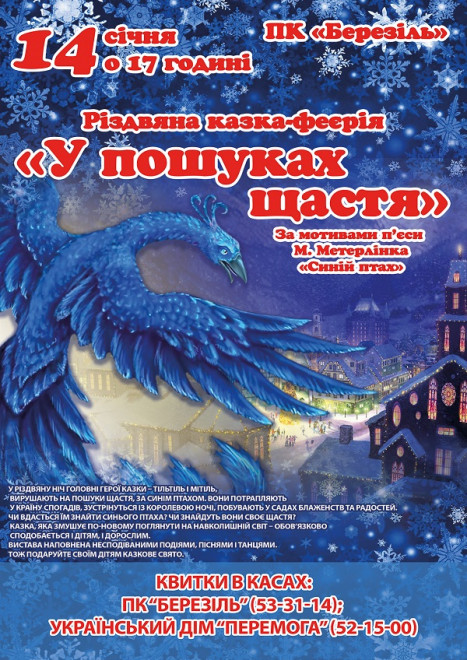 14 січня о 17:00 ПК “Березіль” запрошує маленьких глядачів на перегляд різдвяної казки-феєрії “У пошуках щастя”. За мотивами п’єси Моріса Метерлінка “Синій птах”.У різдвяну ніч головні герої казки – Тільтіль і Мітіль, вирушають на пошуки щастя, за Синім Птахом. Вони потрапляють у країну Спогадів, зустрінуться із королевою ночі, побувають у садах блаженств та радостей.