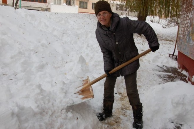 — На базарчику купила за 50 гривень. А що було робити, коли дали пластмасову, а вона відразу й тріснула… Виходжу щоранку о 5-ій в двір і пахаю до обіду, — усміхається. — «Давай 500 гривень, розчищу двір», — запропонував один мужик. Та ну, такі гроші платити. Руки, ноги є — сама зроблю! А вчора незнайома жінка прийшла з лопатою і просто так допомогла повідкидати сніг. Є добрі люди! Я обслуговую два будинки, в одному живуть два депутати, то двірники не дуже хотіли брати той дім. А я не боюся, вони ж такі люди, як і я, до того ж виконую свою роботу сумлінно.
