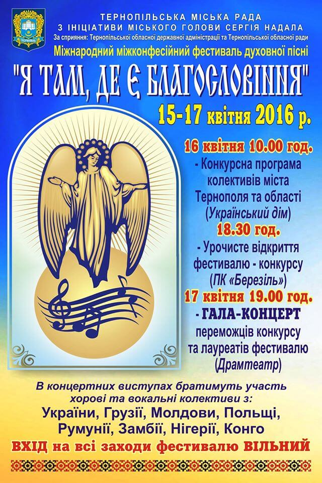 З 15 по 17 квітня у Тернополі відбуватиметься шостий фестиваль-конкурс «Я там, де є благословіння». У концертних виступах братимуть участь хори із Польщі, Молдови, Грузії, Румунії, зведений колектив із Замбії, Конго, Нігерії, а також учасники із українських міст Маріуполь, Хмельницький та Тернопіль.