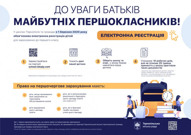 З 1 березня по 29 травня 2020 року у школах Тернополя триває обов’язкова електронна реєстрація дітей для зарахування до першого класу через систему, яка працює на основі технології BlockchainДля реєстрації батькам необхідно використовувати портал https://school.bloqly.com/#
