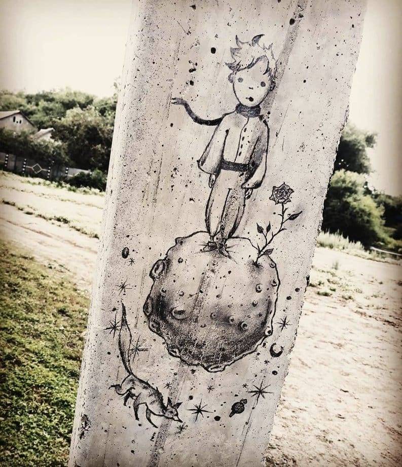 Малював на тротуарі, вдома на бруківці. Одного разу побачив біля дому майже глянцевий стовп і олівцем намалював ілюстрацію з книги “Маленький принц”. Мені дуже сподобався цей малюнок, я майже кожного дня виходив і дивився на нього. Був він мінімум три роки.