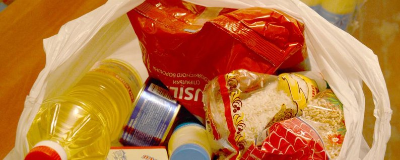 В продуктових наборах — крупи, олія, сіль, цукор, чай, печиво, макарони.