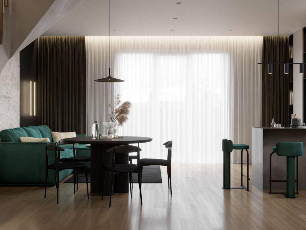 Готовий 3D-проєкт демонструється клієнту для узгодження. За необхідності вносять правки. Далі згідно з проєктом здійснюється ремонт, встановлюються системи опалення, вентиляції, освітлення, виконується оздоблення. Обов’язковим є авторський нагляд дизайнера під час виконання всіх робіт. Установка меблів, текстилю, предметів мистецтва, освітлювальних приладів завершує роботу над інтер’єром котеджу. Після ретельної перевірки дизайнер передає клієнту повністю готовий до проживання будинок.