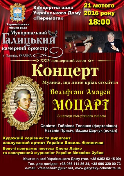 21 лютого о 18.00 год. в Українському домі «Перемога» відбудеться святкова імпреза – концертна програма «Музика, що лине крізь століття. Вольфганг Амадей Моцарт», який присвячений 260-літньому ювілею австрійського композитора Вольфганга Амадея Моцарта.