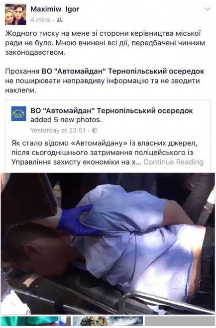 “Стосовно вчорашніх подій жодного тиску зі сторони керівництва міської ради на мене вчинялося. Прохання не поширювати неправдиву інформацію автомайдану. У цій справі мною було вчинено абсолютно всі дії передбачені чинним законодавством”, – зазначив керівник муніципальної поліції Тернополя Ігор Максимів на своїй сторінці у facebook.