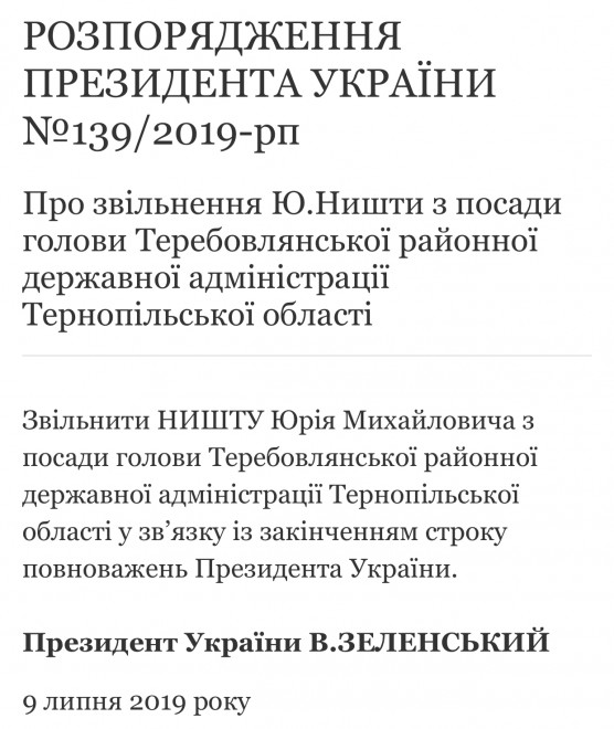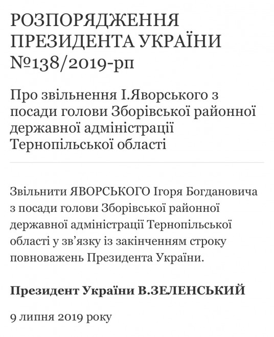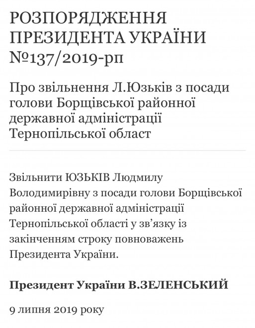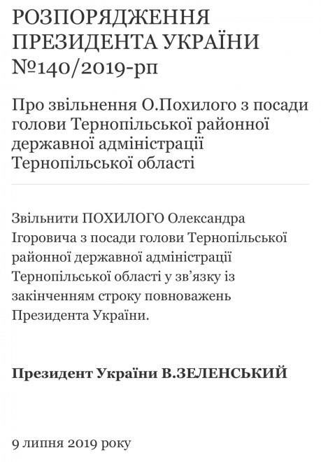 Президент України Володимир Зеленський звільним із займаних посад голів Тернопільської, Зборівської, Борщівської та Теребовлянської РДА.