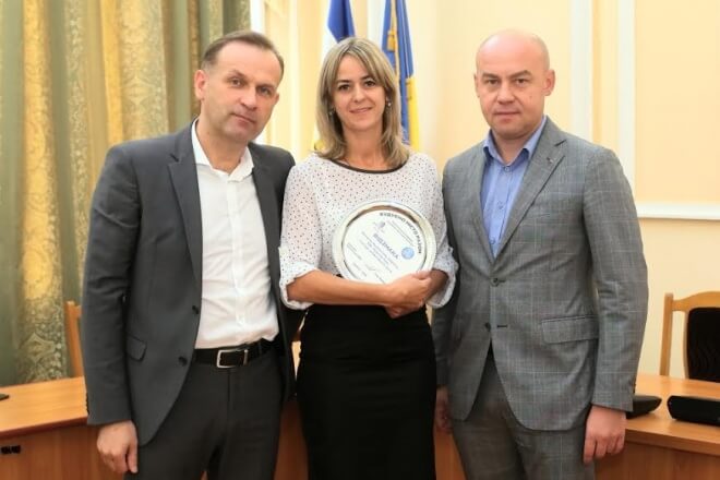 На фото: начальник Тернопільської ОДПІ ГУ ДФС в області Петро Якимчук, заступник директора будівельної компанії «Креатор-Буд» Ліна Прокопів та міський голова Тернополя Сергій Надал під час нагородження