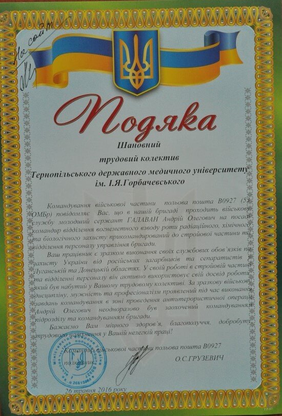 На адресу Тернопільського державного медичного університету імені І.Горбачевського надійшла подяка від командира військової частини, в якій проходить військову службу працівник ТДМУ Андрій Галаван.