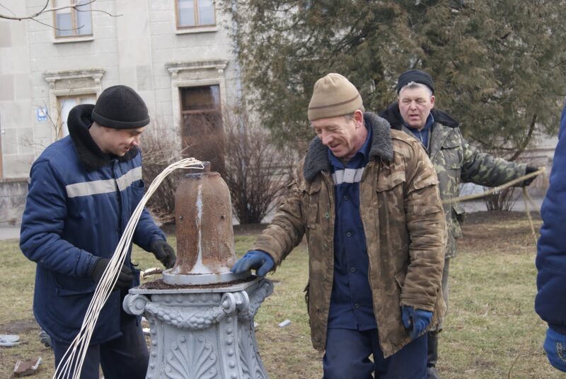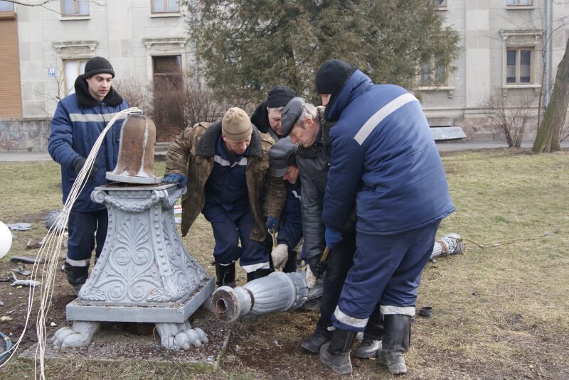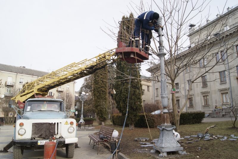 Як повідомив директор КП «Тернопільміськсвітло» Олег Лехіцький, старовинні чавунні опори встановлені близько пів століття тому. Плафони змінювали, а от самі опори кардинальних ремонтів не зазнали: здійснювався лише «косметичний» ремонт та фарбування. Зважаючи на те, що всередині вони вже вкриті іржею, працівники демонтували усі елементи. Після проведення ряду робіт, ті ж світильники повернуть на місце.