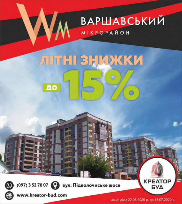 З 22-го червня до 15-го липня знижки на квартири у ВАРШАВСЬКОМУ МІКРОРАЙОНІ – до 15-ти відсотків. То ж, придбавши омріяне житло, одночасно можна заощадити кошти для сімейного відпочинку. Відділ продажу квартир працює щодня, окрім вихідних, на території будівництва мікрорайону, Підволочиське шосе, (поруч Збаразького кільця).