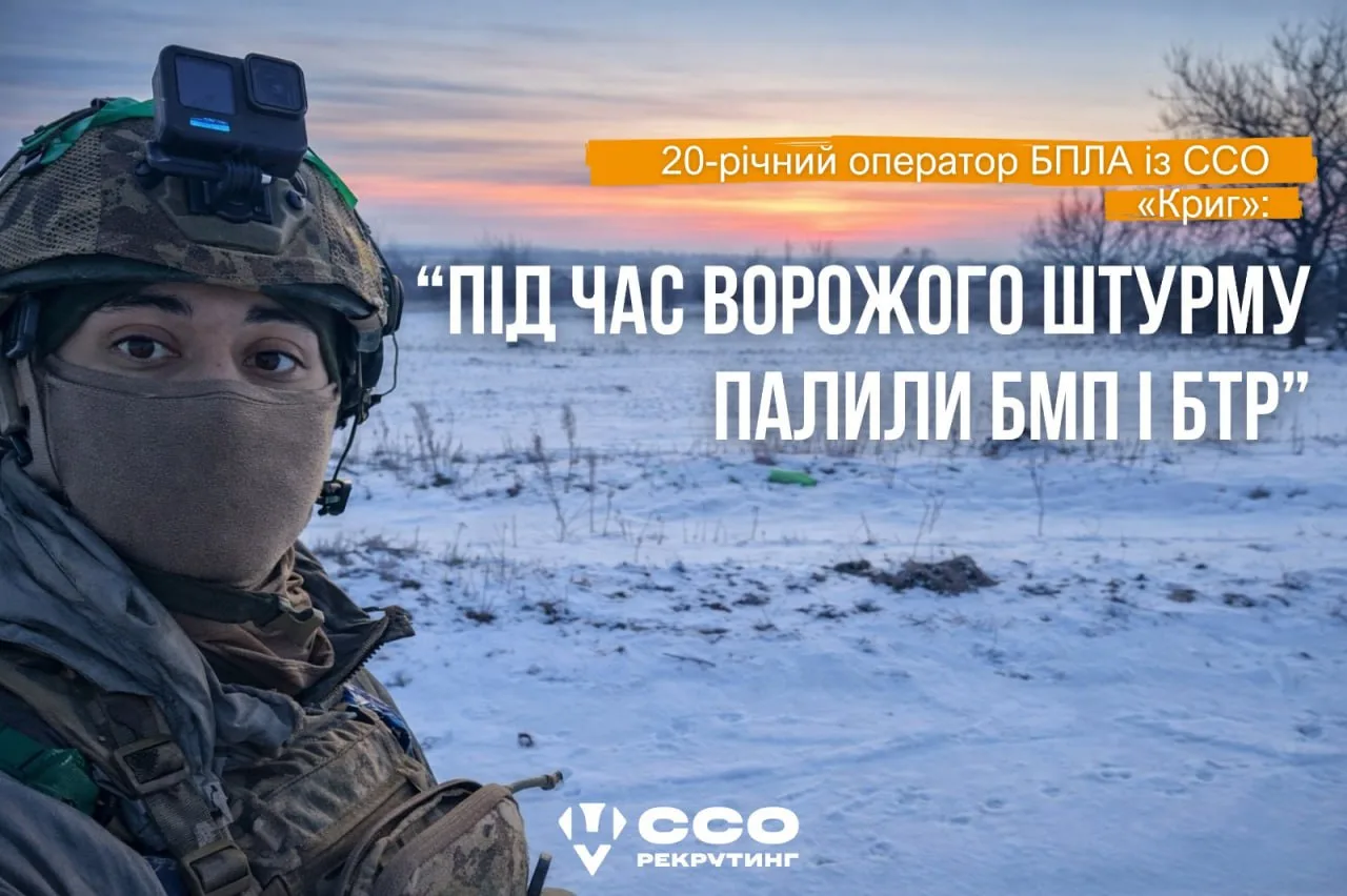 Йому лише двадцять, але в його руках — доля ворожої бронетехніки. Боєць Сил спеціальних операцій на псевдо «Криг» став справжньою легендою свого підрозділу після того, як під час одного з ворожих штурмів зміг філігранно спалити БМП та БТР окупантів. Для молодого оператора БпЛА це не просто робота, а ювелірне мистецтво знищення ворога.
