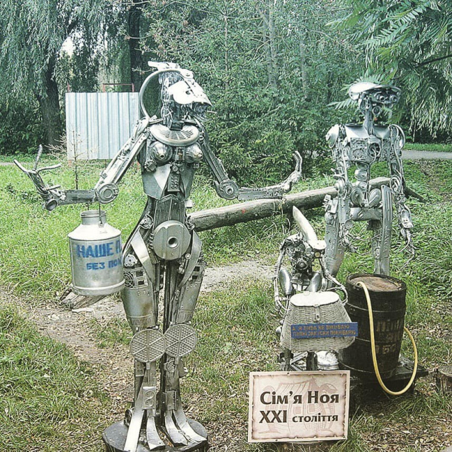 Сім’я з трьох роботів – перша чудернацька композиція, яку встановили біля ресторації “Ковчег” у Тернополі, назвавши її “Сім’я Ноя ХХІ століття”. Автор композиції – Сергій Кузнєцов.
