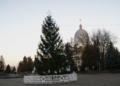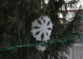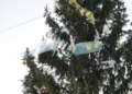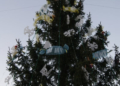 Ялинка прикрашена у патріотичному стилі – це тризуби, жовто-блакитні стрічки та написи із закликами до миру. А ще – лаконічні білосніжні сніжинки, сповнені позитивними емоціями та передноворічним настроєм. До слова, усі прикраси для ялинки виготовлені руками підприємства ПП “Східний масив”, які творчо підходять до оздоблення ялинки , щороку додаючи нові елементи.