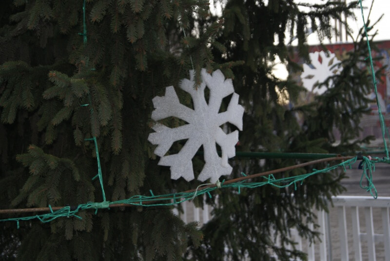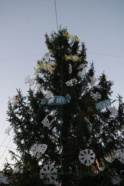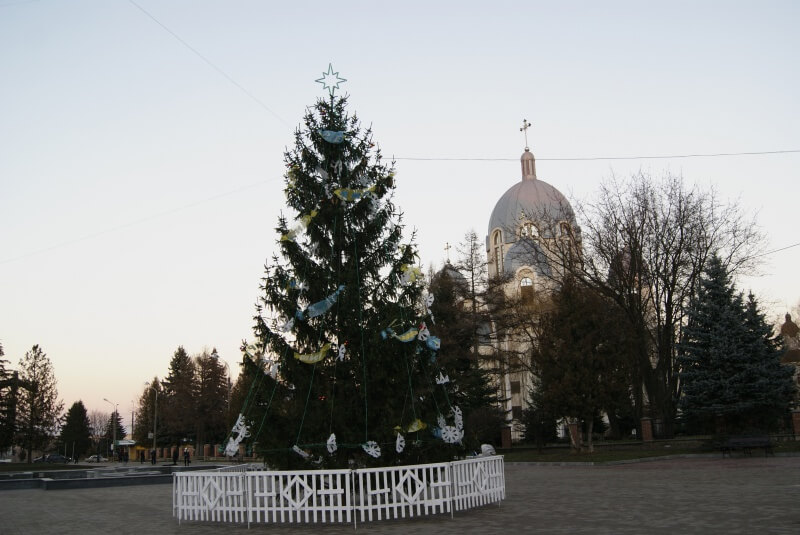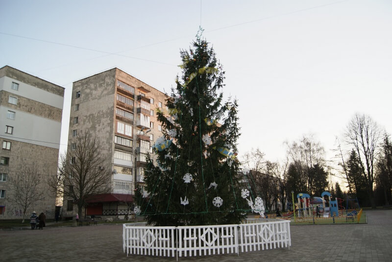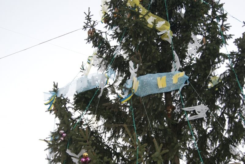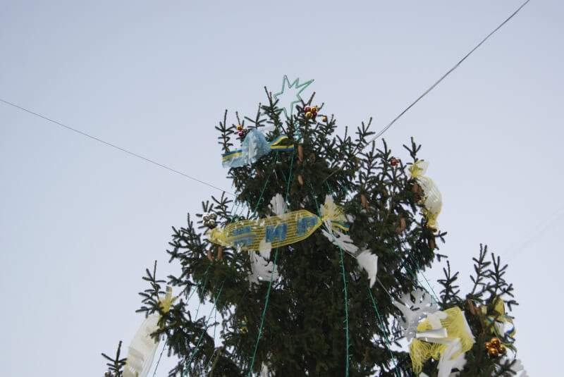Ялинка прикрашена у патріотичному стилі – це тризуби, жовто-блакитні стрічки та написи із закликами до миру. А ще – лаконічні білосніжні сніжинки, сповнені позитивними емоціями та передноворічним настроєм. До слова, усі прикраси для ялинки виготовлені руками підприємства ПП “Східний масив”, які творчо підходять до оздоблення ялинки , щороку додаючи нові елементи.
