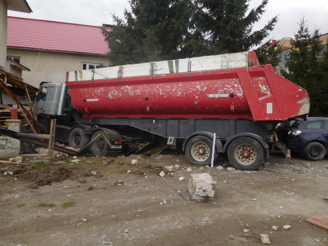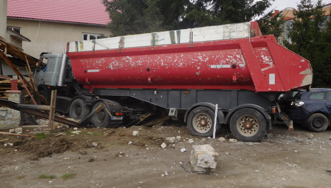 Керуючи технічно несправним автопоїздом у складі сідлового тягача та напівпричепа з вантажем більше 20 тонн, допустив виїзд автопоїзда на тротуар.