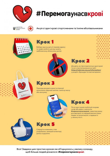 Акція «Перемога у нас в крові»: спортсмени та їх вболівальники стають донорами крові. За ініціативи Товариства Червоного Хреста України і Міністерства молоді та спорту України, за підтримки комунікаційної агенції Ogilvy Україна, яка виступає в ролі автора ідеї та комунікаційного партнера проекту, з 12-го червня 2020 року стартує всеукраїнська донорська акція «Перемога у нас в крові» (за хештегом #перемогаунасвкрові). Вона закликає спортсменів, їхніх фанів і загалом всіх українців долучитися до благодійної справи та допомогти тим, хто потребує донорської крові у щоденній боротьбі за своє здоров’я та життя.