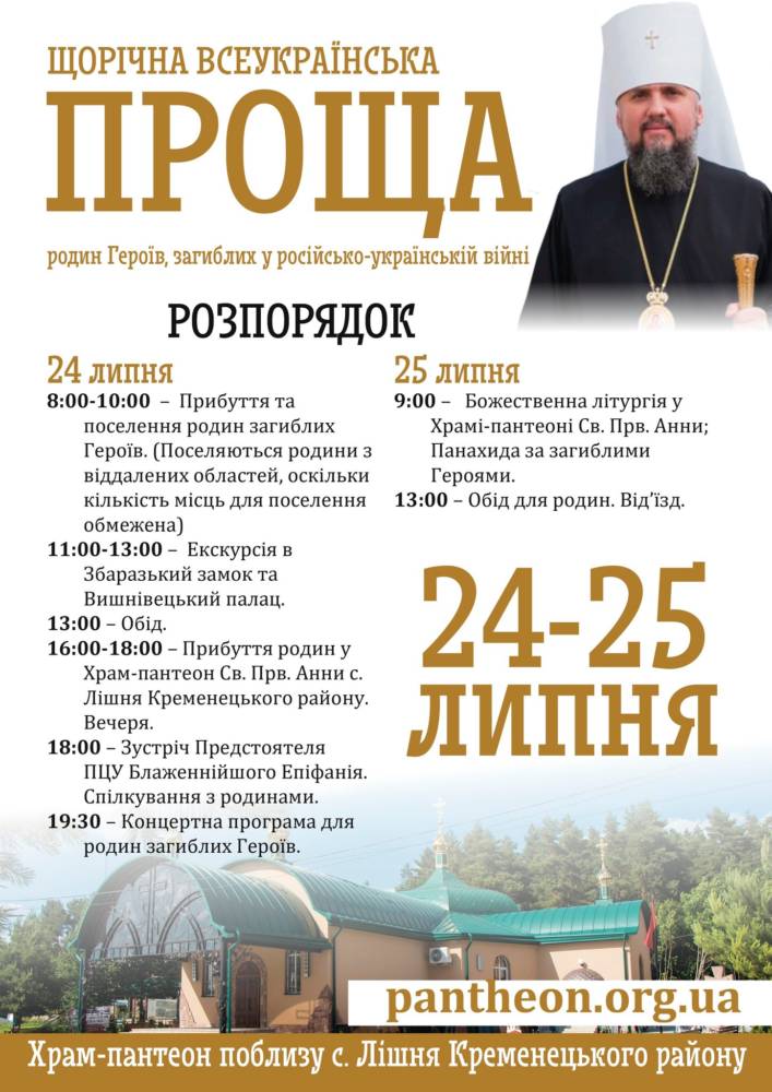 Прощу організовує Всеукраїнський храм-пантеон святої праведної Анни. У програмі заплановано поселення родин, екскурсії, зустріч із Предстоятелем ПЦУ Блаженнійшим Епіфанієм, спільна молитва та панахида за загиблими.