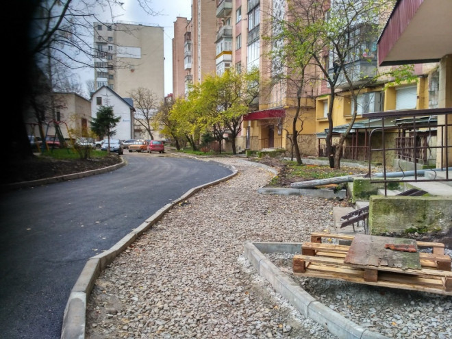 Також підрядники влаштували нові бордюри та встановили обмежувачі руху. Найближчими днями розпочнуть влаштування пішохідних доріжок поблизу будинку фігурними елементами мощення.