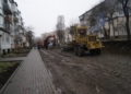 Тут вже здійснені підготовчі роботи та встановлено бордюрний камінь, а пішохідну частину вимощено бруківкою. Працівники підрядної організації розширили проїжджу частину дороги поблизу будинку.