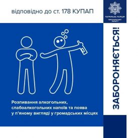 Працівники правоохоронних органів нагадують: перебування у громадських місцях у п’яному вигляді та розпивання алкогольних напоїв — це порушення закону.