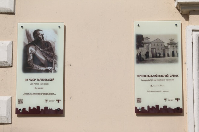 «На анотаційній дошці, розміром 1х0,5 метри, розміщене зображення зруйнованих під час війни пам’яток архітектури, інформація про дати будівництва, руйнування об’єкту та QR-код, через який тернополяни та гості міста можуть дізнатися більше інформації про історичні будівлі, – розповідає начальник управління стратегічного розвитку міста Юрій Дейнека. – Наразі через код доступна інформація тільки українською мовою, проте за декілька місяців ми оновимо її ще англійською та польською мовами для зручності тих гостей, хто приїжджає із-за кордону».
