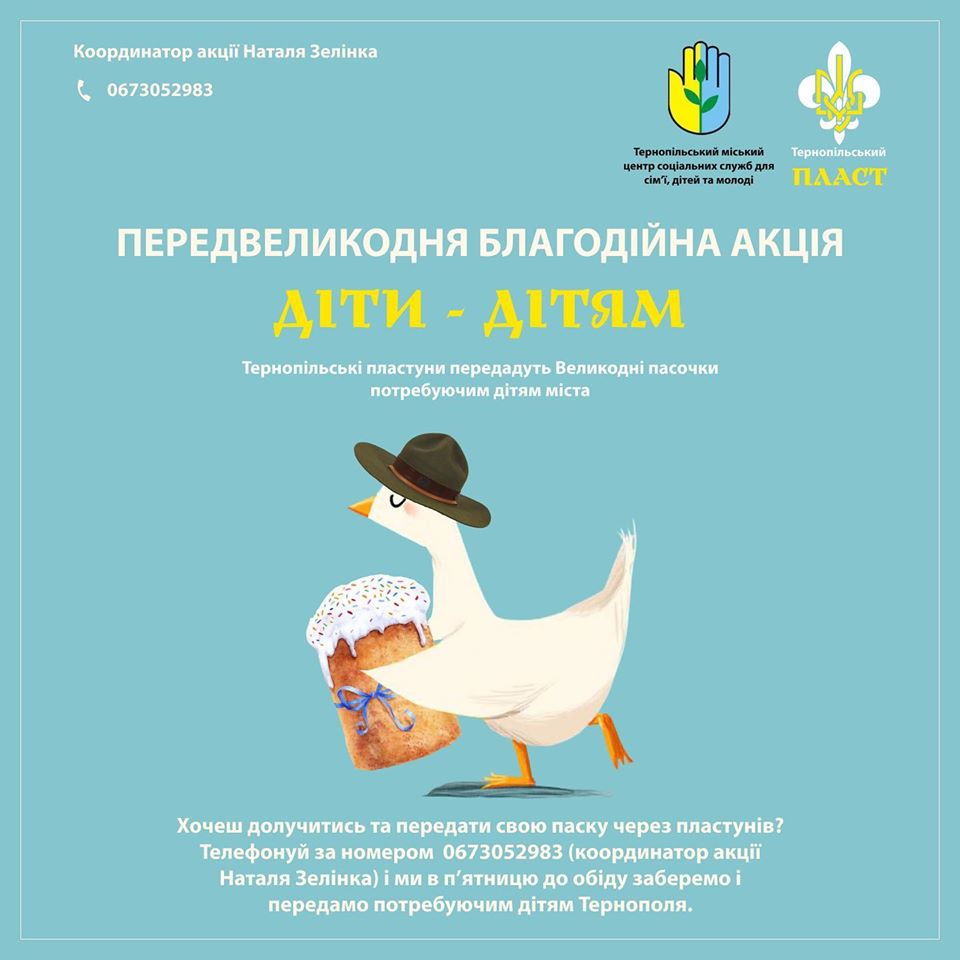 Кожен бажаючий також може долучитись до доброї справи та передати свою паску через пластунів. Ви можете спекти невеликі дитячі пасочки, зателефонувати за номером 0673052983 (координатор акції Наталя Зелінка) і ми в п’ятницю до обіду заберемо їх і передамо потребуючим дітям Тернополя.