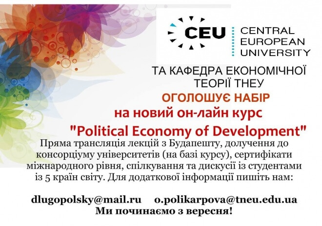 Колектив кафедри економічної теорії Тернопільського національного економічного університету спільно з Central European University оголошує набір на нові он-лайн курси: «Political Economy of Development» та «Korea in International Relations»!