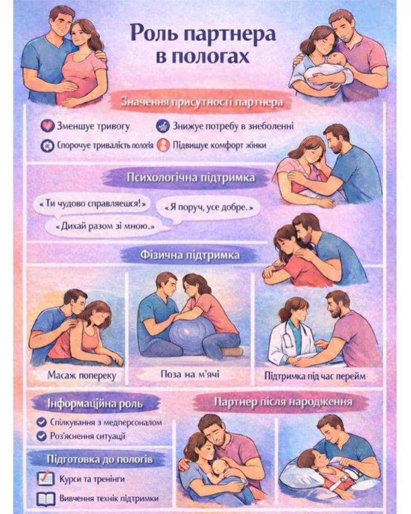 Головна перевага — це відчуття безпеки. Коли поруч чоловік, мама чи близька подруга, рівень стресу у породіллі значно знижується. Партнер допомагає не лише морально, а й фізично: нагадує про правильне дихання, робить масаж спини або просто подає воду. Це дозволяє жінці зосередитися на процесі, знаючи, що поруч є надійне плече.