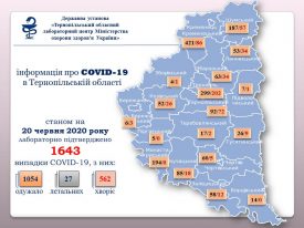 На Тернопільщині, за попередню добу підтверджено 38 випадків зараження вірусом COVID-19Станом на 20 червня 2020 року в Тернопільській області за результатами досліджень методом ПЛР – у 1643 випадках діагноз лабораторно підтверджений (1506 випадків – дорослі, 137 випадків – діти), з них 27 летальних. Видужало 1054 особи.