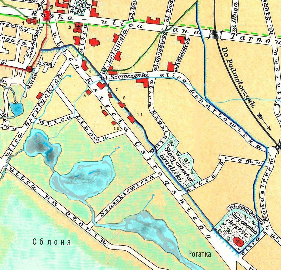 Пройдемось вулицею Острозького з її початку. Першими по обох боках стоять післявоєнні будівлі. За ними з лівого боку лишився старий будинок в якому у 50-ті-60-ті роки був радіокомітет (Мал..), а далі знов новий житловий будинок – місце скупчення культурних, освітніх і лікувальних закладів, де були споруджені: єврейський шпиталь з аптекою (Мал.4.), будинок (Мал.5.) міщанського братства – Сокіл руський (збудований у 1903 р. на місці розвалених військових казарм, а в кінці 1950-х років добудований вліво (Мал.6.) і названий Будинком культури (Мал.7), а зараз обласною філармонією), українська і польська захоронки – будинки-інтернати для мало забезпечених дітей (Мал.8 і Мал.9), благодійне Завєдєніє графа Острозького (Мал.10), і, головне, Монастирська церква або Успєнія пресвятої Богородиці(Мал.11). Тут в різні часи було майже все, що потрібно людині – пологовий будинок, лікарні, дитячі заклади, школи, житлові і молитовні будинки, церкви, магазини, адвокатура, автоінспекція, суд, пошта і, на кінець, цвинтарі.