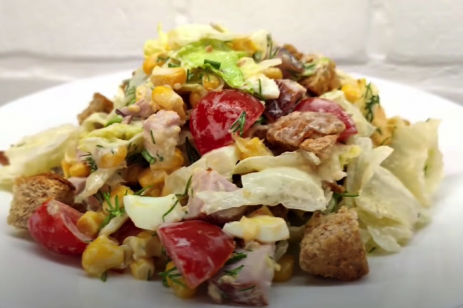 З шинкою та грінками: – 1 салат айсберг ( можна інший салат) – 200 г копченої шинки – 3 варених яйця – 250 г помідорів – 4 ст.л конс. кукурудзи – майонез -1 зубчик часнику – зелень ( за бажанням) – 35-50 г сухариків Приготування сухариків: – 4 шматочки хліба – 2 ст.л олії – спеції за смаком Хліб нарізати кубиками, додати спеції та олію, перемішати. Висушити в духовці або мікрохвильовій печі.