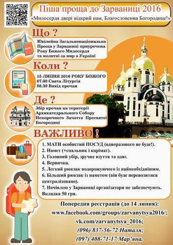 Більше інформації про Загальнонаціональну прощу в Зарваниці шукайте у групах:http://vk.com/zarvanytsya_2016  або https://www.facebook.com/groups/zarvanytsya2016/